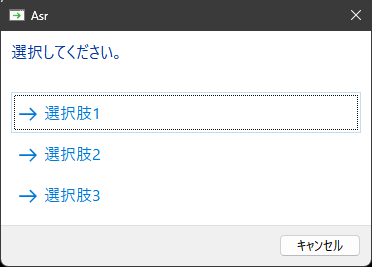 選択肢の1個目を選択すると0、2個目を選択すると1、3個目を選択すると2のようにインデックス番号をを返します。 選択をキャンセルした場合は-1を返します。 選択肢は最大で20個まで使用可能であり、21個以降は無視されて表示されません。 「デフォルトフォーカスのインデックス」は省略可能で、省略した場合は0(1個目にデフォルトフォーカス)とみなされます。 また選択肢の数を超えた場合、負の数、数値変換不能な桁の場合は0が指定されたものとみなします。 なお文字列が全て数字の場合に「デフォルトフォーカスのインデックス」が指定されたと認識しますので、省略の際の「選択タイトル」の記述にご注意ください。 【書式】 SelectDialog,[デフォルトフォーカスのインデックス,]選択のタイトル,選択肢1,選択肢,選択肢3,・・・ 【例】 var $SelectValue$ = SelectDialog,選択してください。,選択肢1,選択肢2,選択肢3 MessageBoxOk = $SelectValue$ ![]() 関連項目 ・基本的なスクリプトコマンド ・その他のスクリプトコマンド ・スクリプトコマンドリファレンス ・置換マクロリファレンス ・置換マクロ対応表 ・実行コマンドの違い一覧 ・定義系コマンド一覧 ・ウィンドウ制御文字列の書式 ・復元スクリプト詳細 | |||||||||||